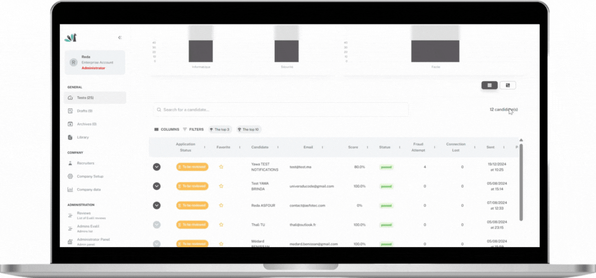 Plus besoin de faire appel à des experts techniques ou métiers pour valider vos candidats.Vous pouvez le faire directement et en toute simplicité grâce aux analyses d’Evalil, présentées sous forme de données et graphiques simplifiés, faciles à interpréter même pour les non-spécialistes.